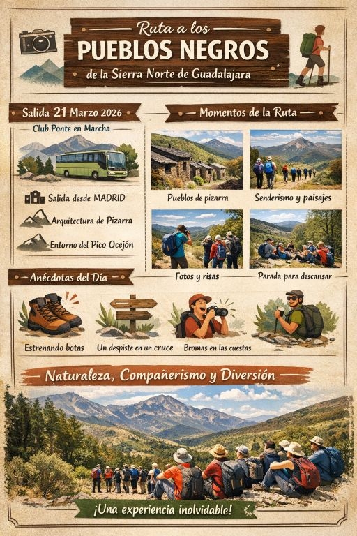 El pasado 21 de marzo de 2026 volvimos a hacer lo que más nos gusta: calzarnos las botas, subirnos al autobús y dejarnos llevar por la montaña. Esta vez, desde Ponte en Marcha pusimos rumbo a los Pueblos Negros de la Arquitectura Negra de la Sierra Norte de Guadalajara, un rincón único donde la pizarra, la historia y la naturaleza se funden en un paisaje que parece detenido en el tiempo.